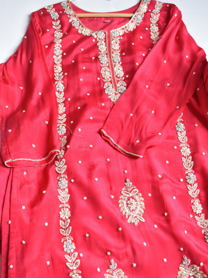 Make a bold statement in our Hot Pink Hues plus-size Chinon suit, featuring elegant handwork in zari, sequin, and moti. With wide-leg dividers and a sheer embroidered dupatta, it's the perfect blend of comfort and festive charm.