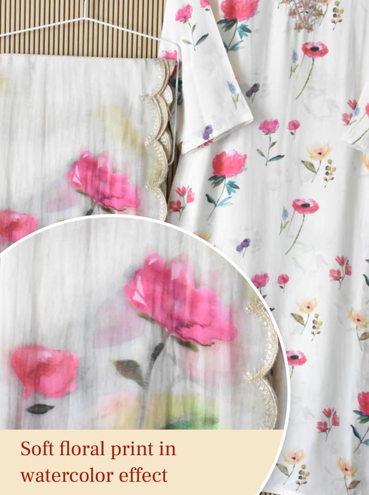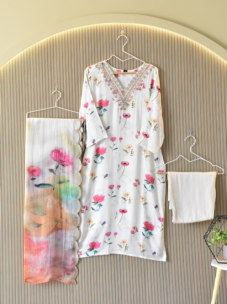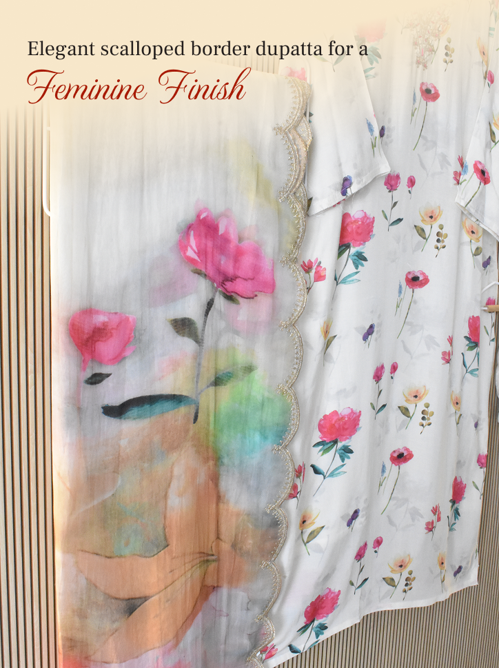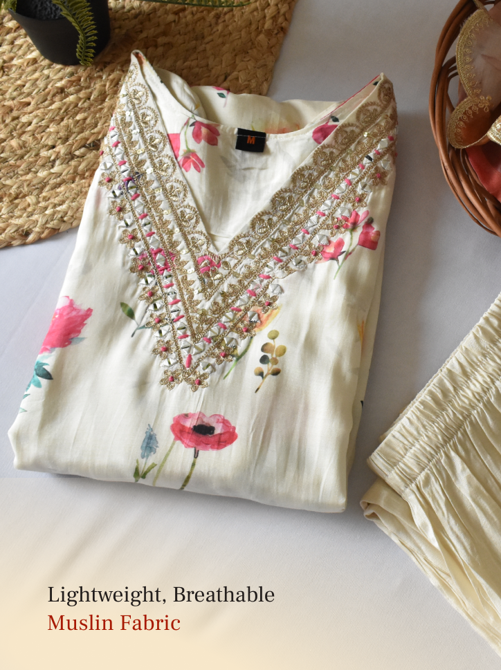 Elegant muslin suit set with V-neck embroidery, mirror work & soft floral prints. Comes with straight pants and a scalloped dupatta — lightweight, breathable & beautifully feminine.
