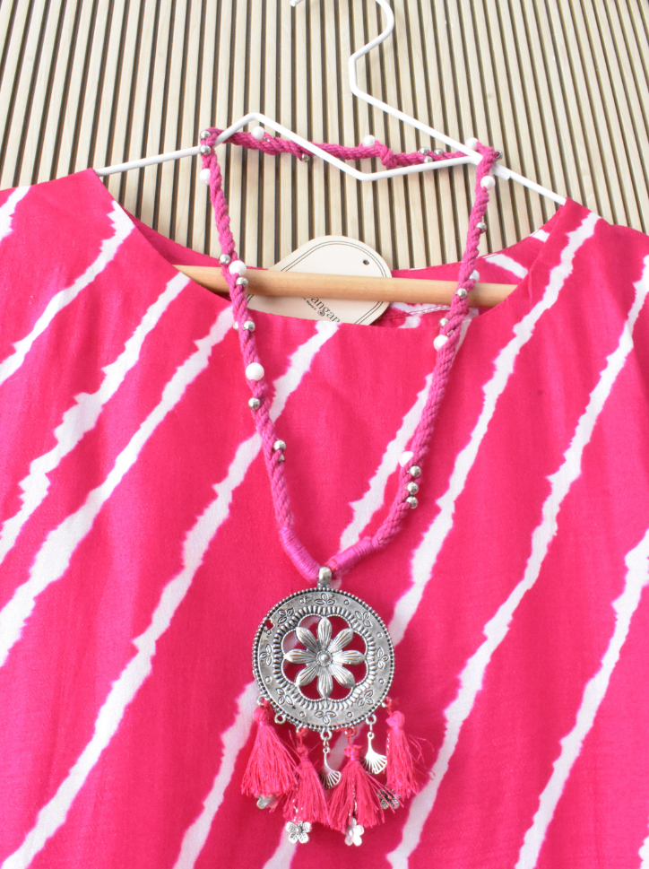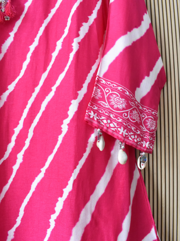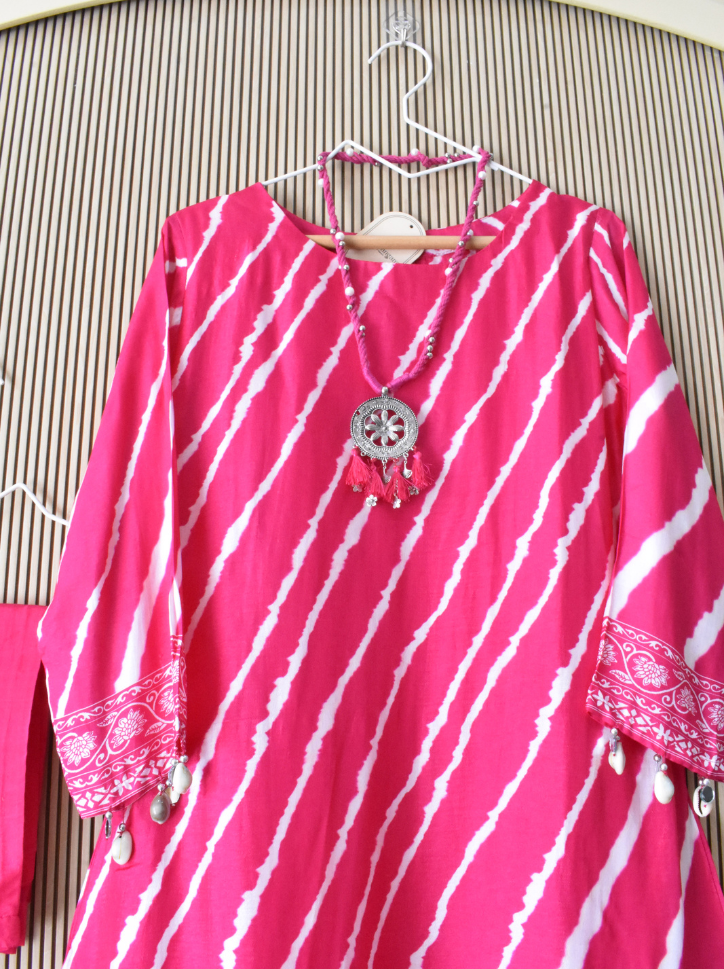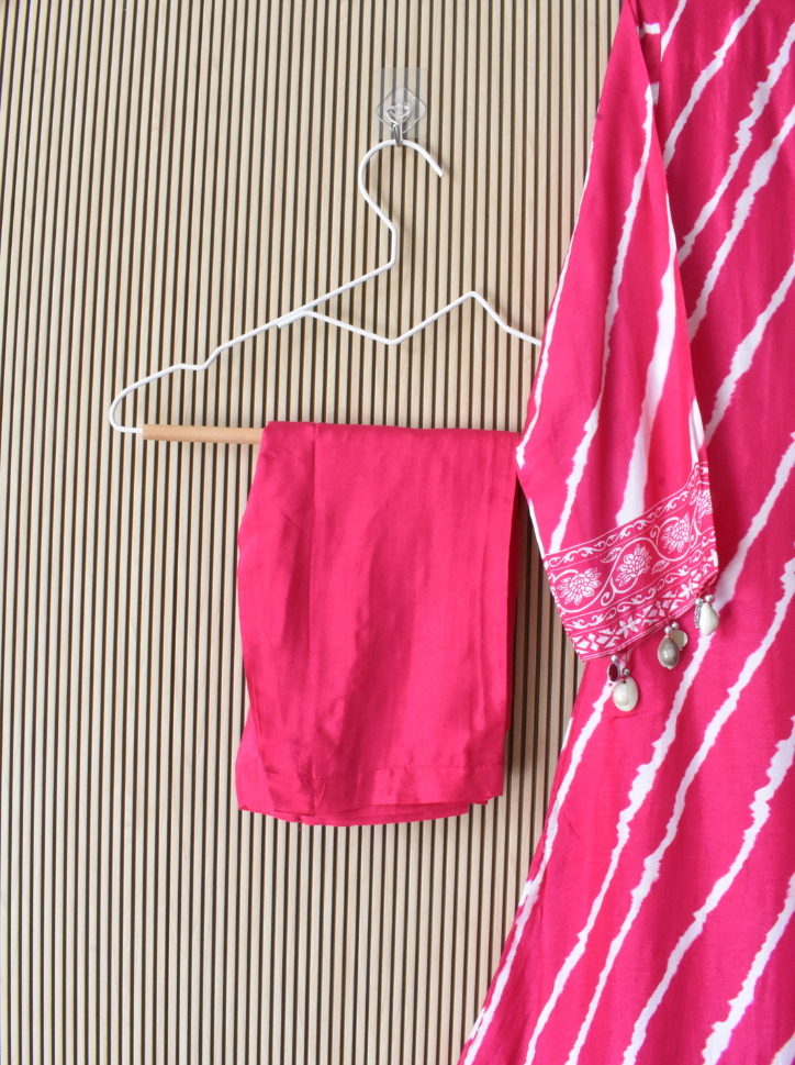 Step into effortless elegance with this bright pink kurta set in luxurious muslin silk. The white diagonal tie-dye stripes create a striking yet graceful look, while the A-line silhouette with side tassels blends comfort with modern charm. The 3/4th sleeves...