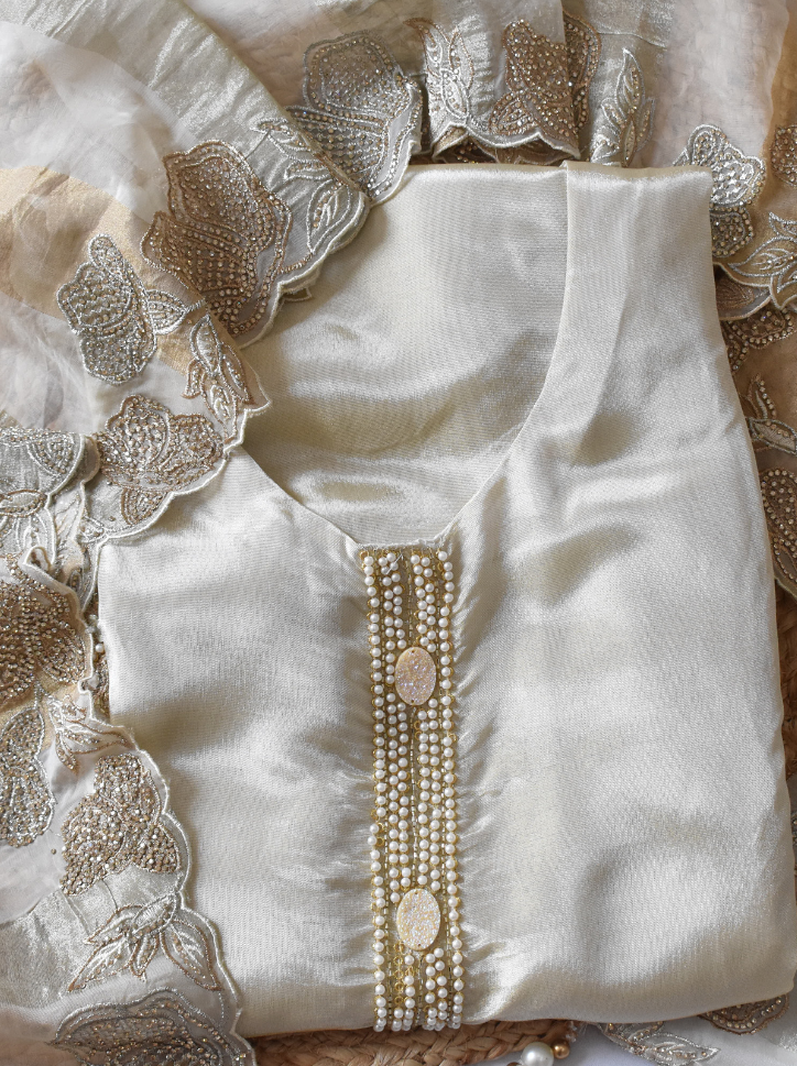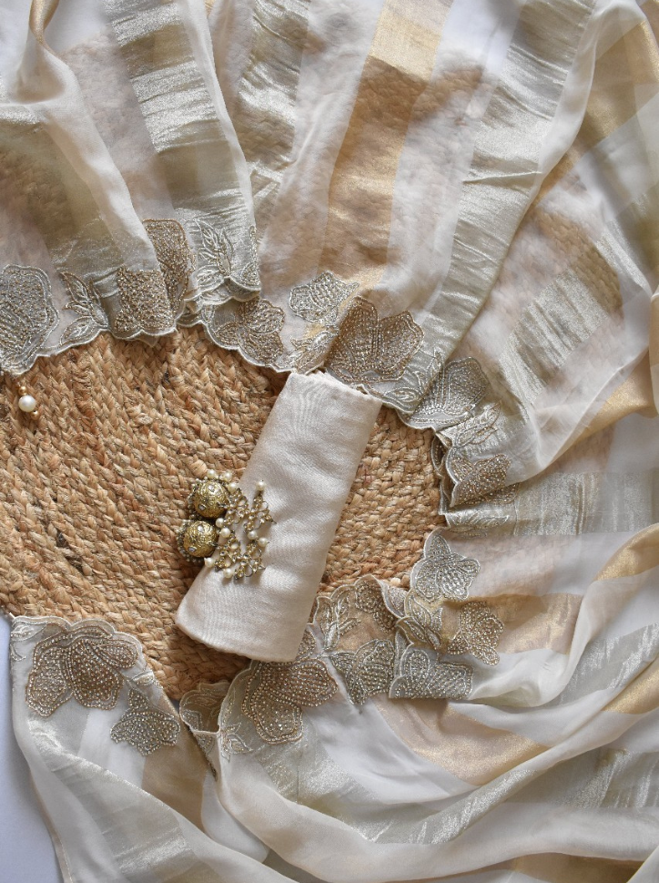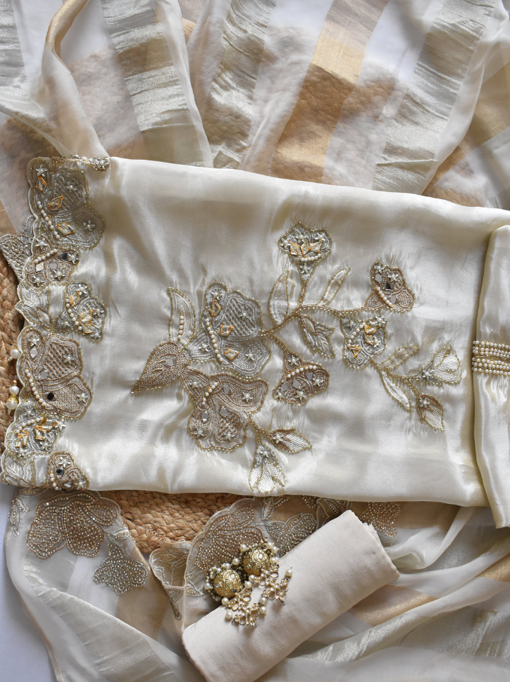 Radiate festive elegance with our Golden Whisper unstitched suit set, featuring a shimmer silk kurta with pearl handwork, a soft organza dupatta with Swarovski and gota detailing, and a soft silk bottom—crafted for celebrations with a touch of opulence. ...