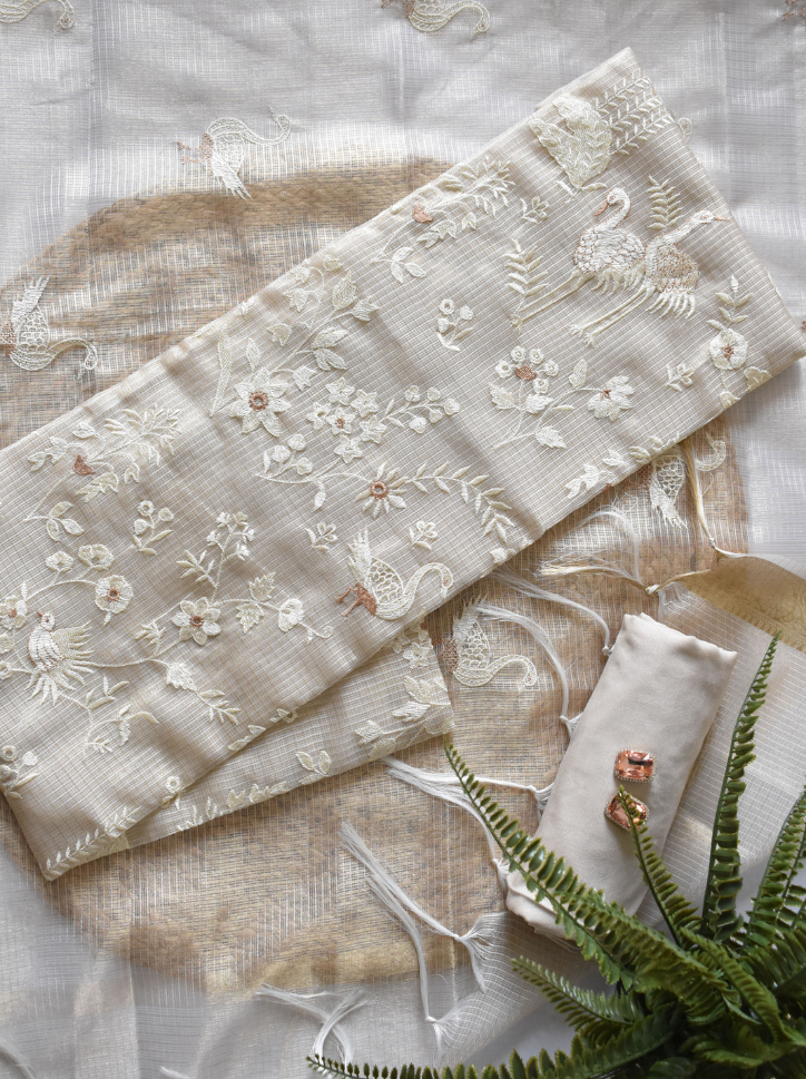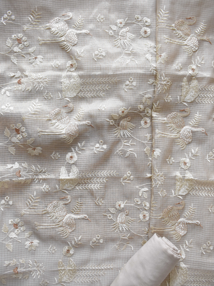 Graceful and airy, this unstitched ivory beige Kota shimmer suit set features delicate swan and floral embroidery with a breezy texture—perfect for elegant daytime festivities.