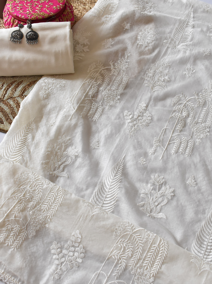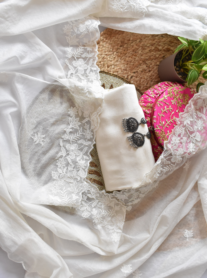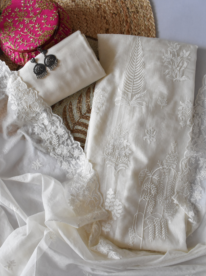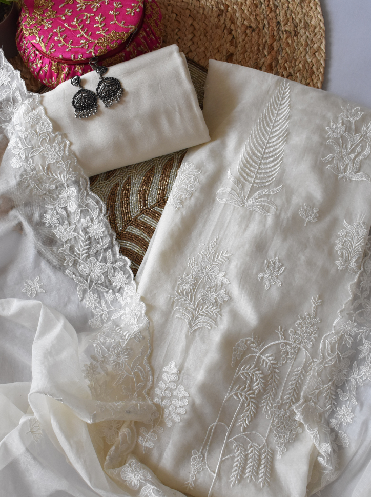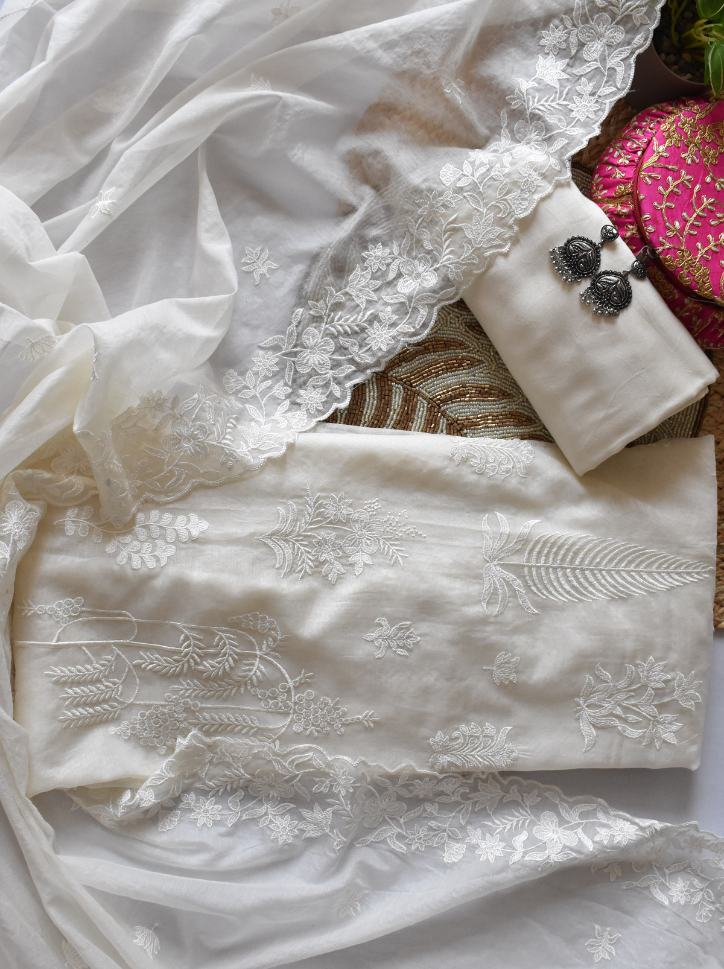 A timeless all-white unstitched suit set in mul chanderi, featuring delicate white thread embroidery and scalloped floral cutwork dupatta—perfect for summer festivities and minimal elegance.