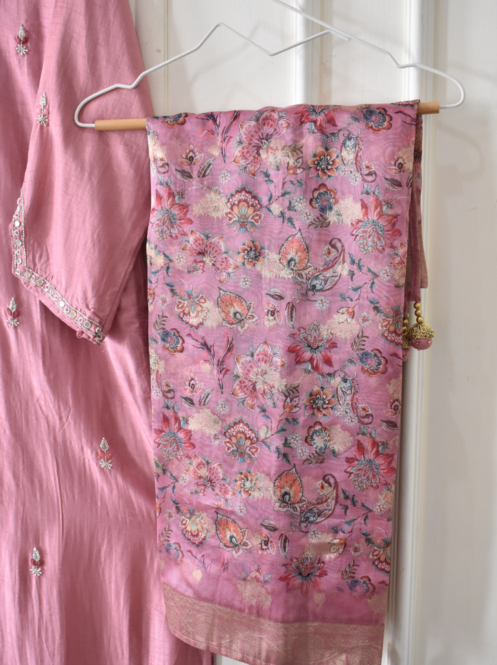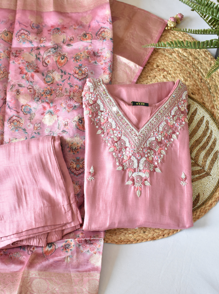 Step into elegance with Amaira, a luxurious plus-size festive suit set crafted in rich Dola Silk. Designed with intricate hand embroidery and paired with a stunning Banarasi Jacquard Dupatta with digital floral prints, this outfit blends tradition with modern sophistication....