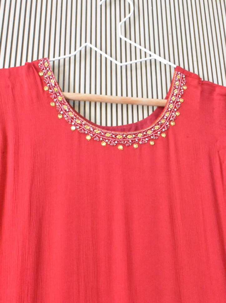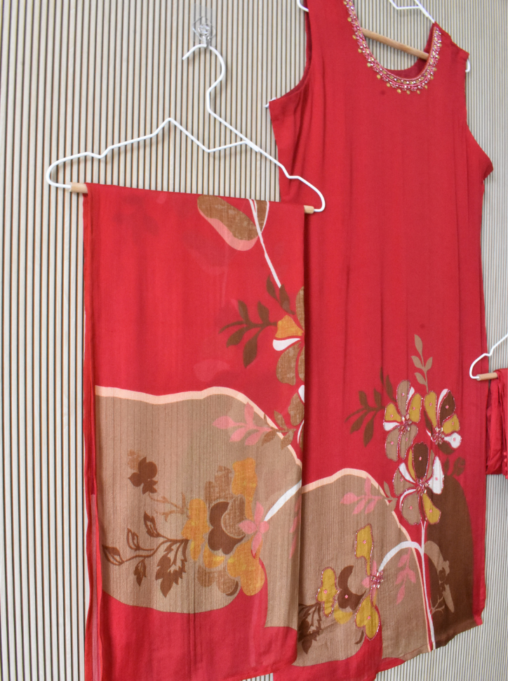 Step into elegance with this plus-size 4-piece ethnic set, thoughtfully designed for comfort and style. The set features: A red sleeveless kurti made of premium chinon fabric, adorned with floral and leaf prints at the hemline. Separate fabric for sleeves,...