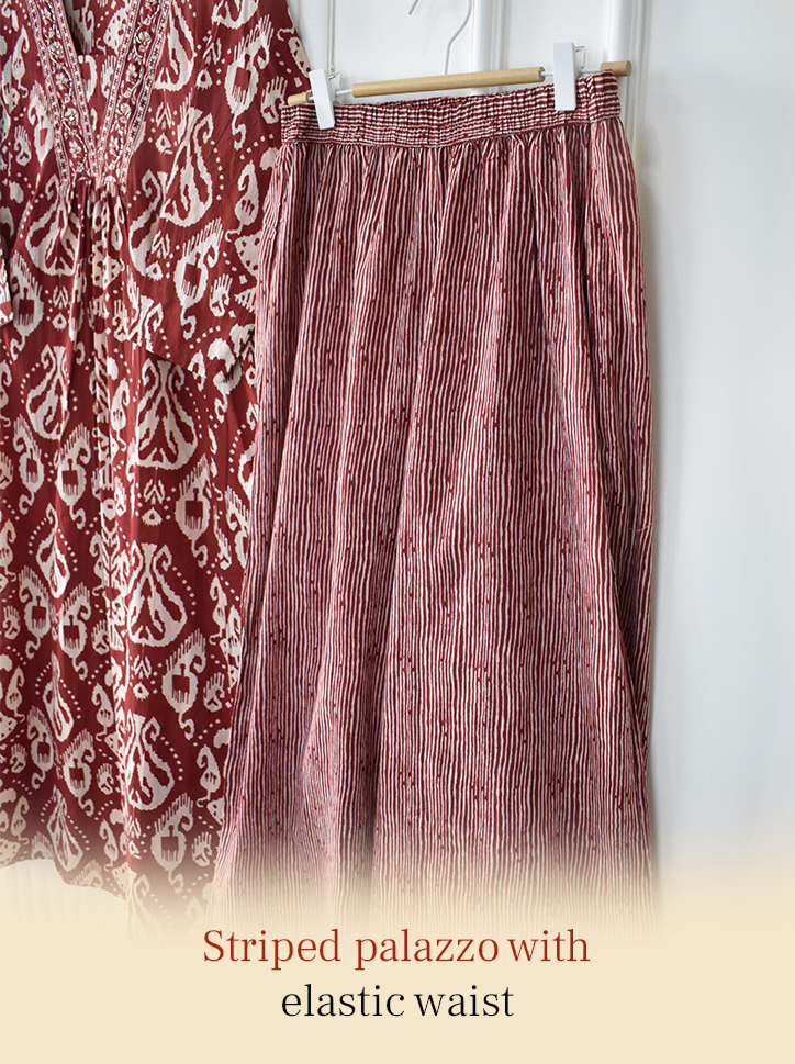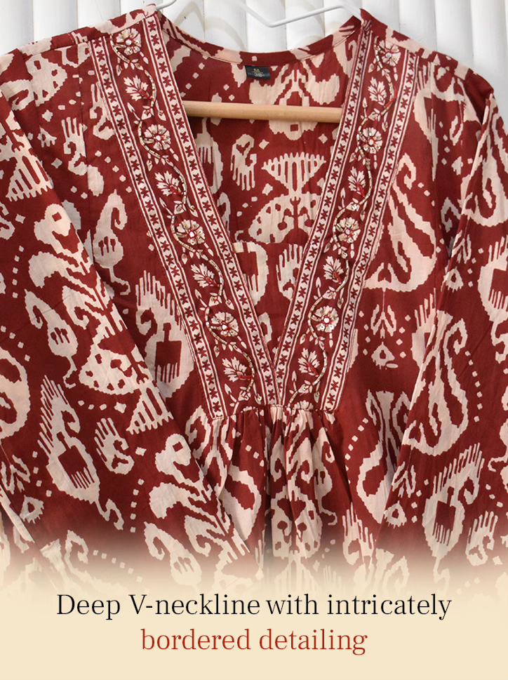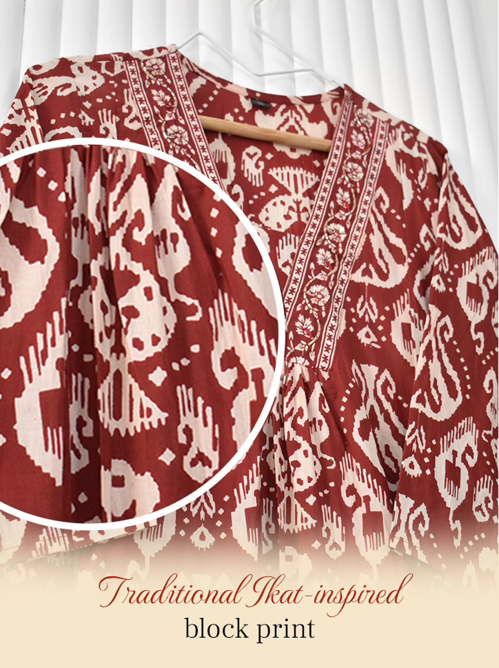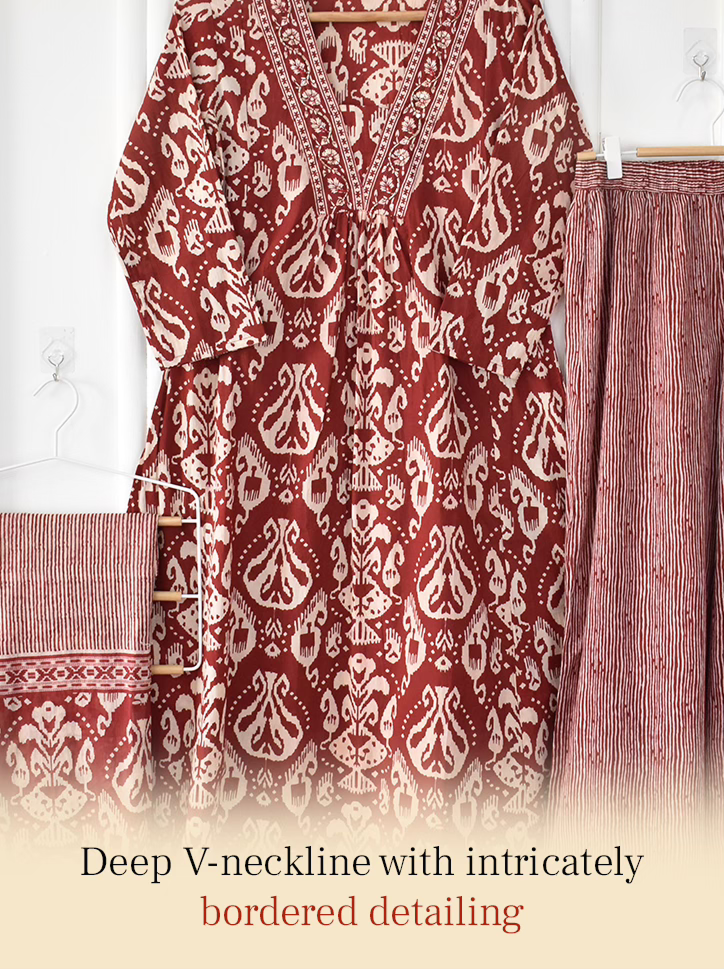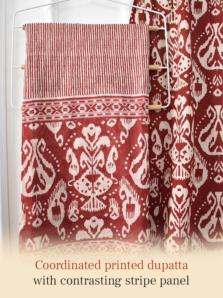 A graceful rust red Ikkat printed suit set in soft, breathable cotton. Designed for all-day comfort and timeless ethnic charm.
