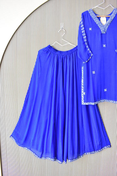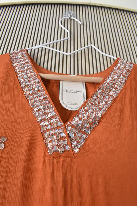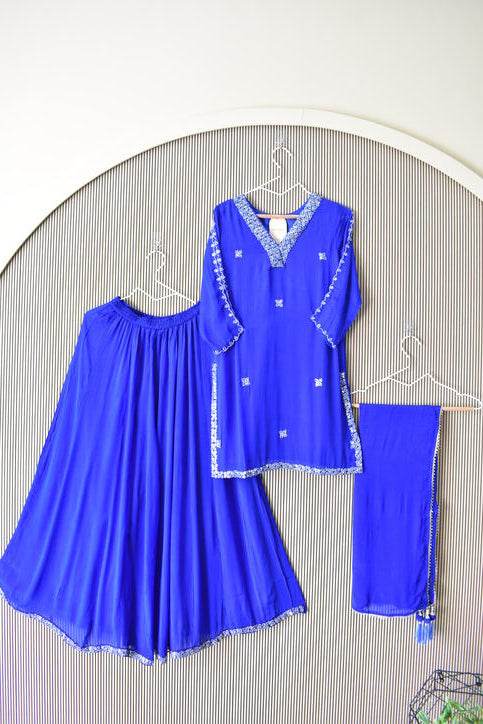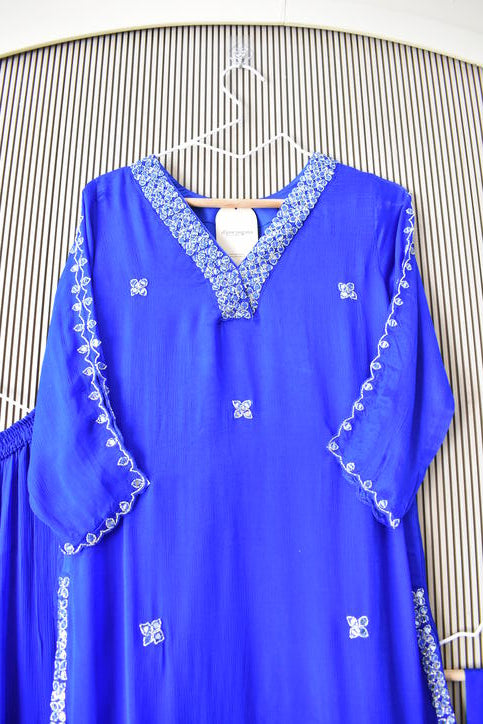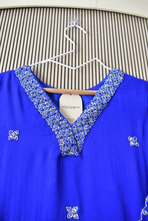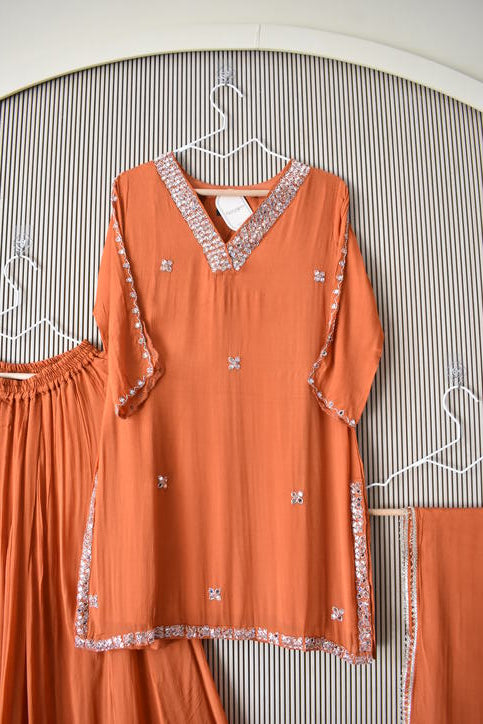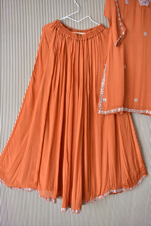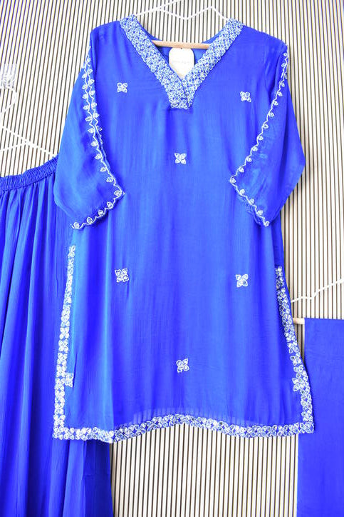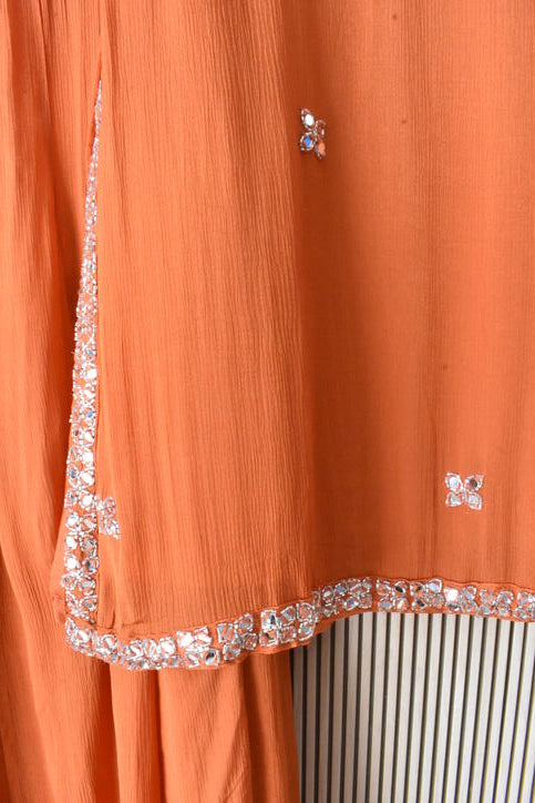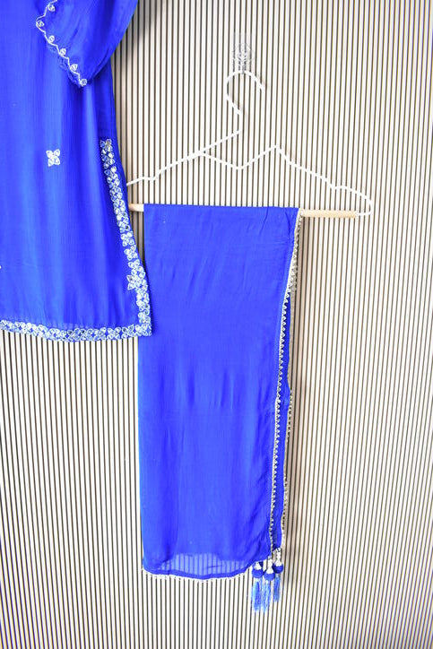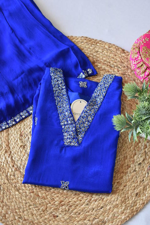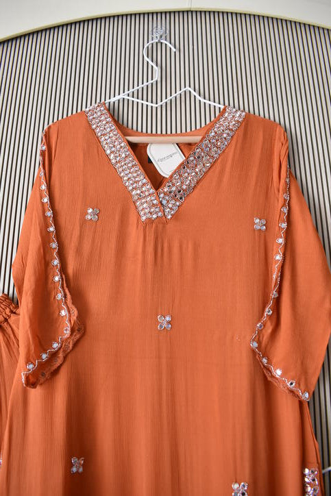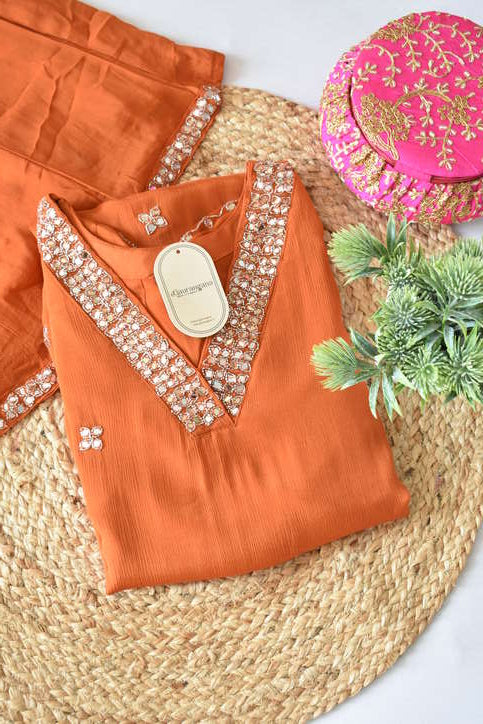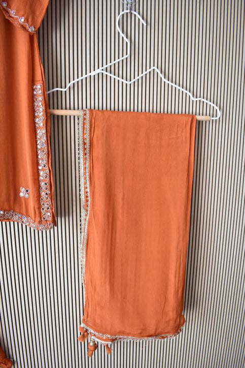 Add elegance to your festive wardrobe with this stunning three-piece kurta set in premium chinon fabric. The kurta features mirror work and delicate hand embroidery on the neckline, sleeves, and borders, with scattered mirror motifs adding a touch of shimmer....