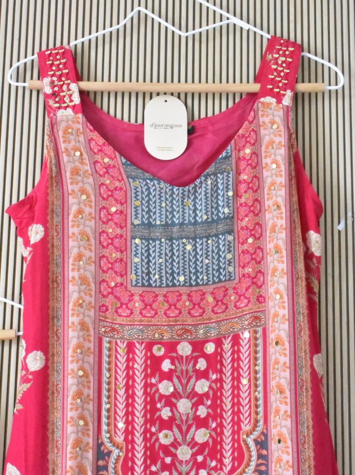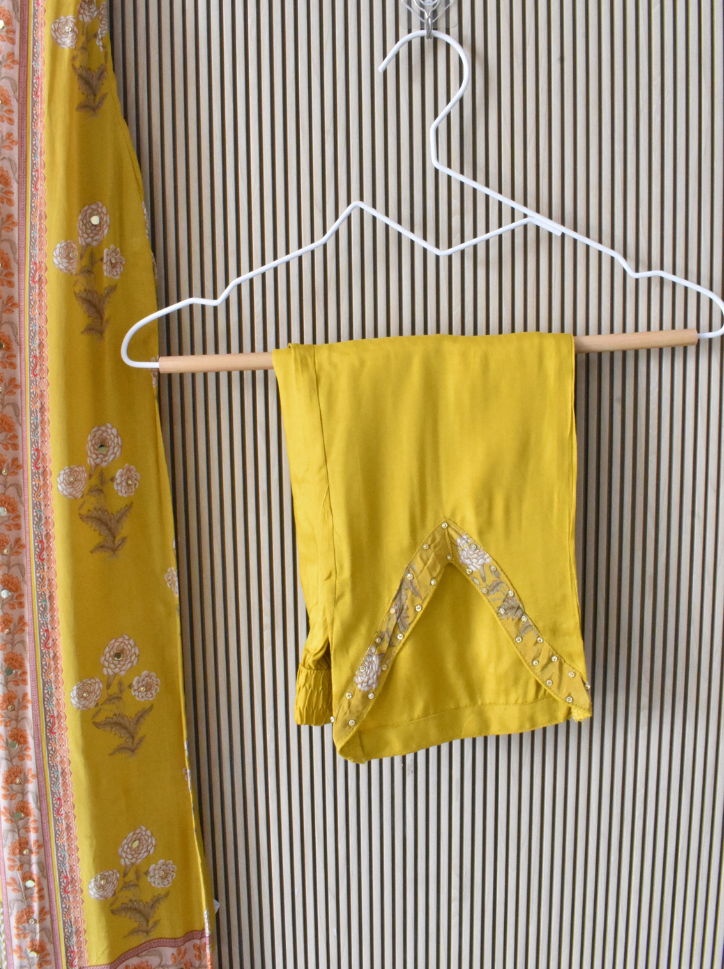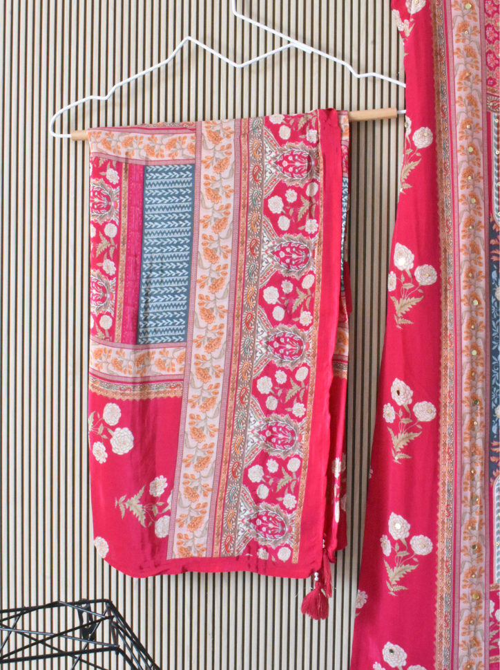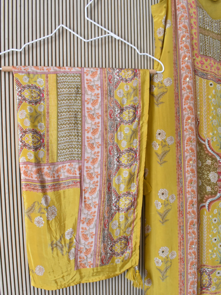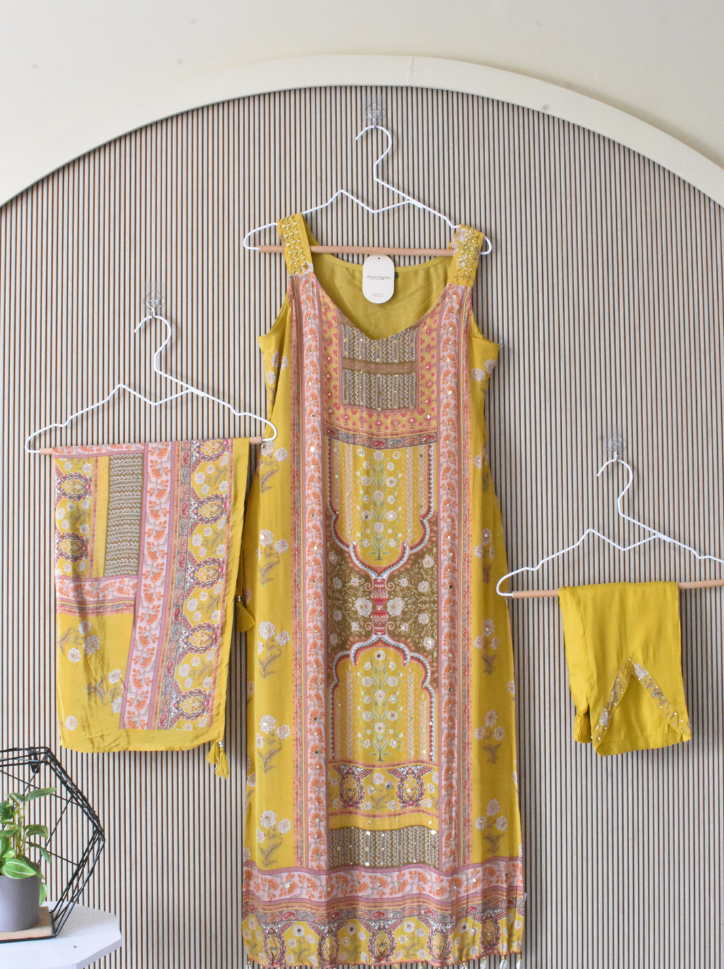 Elevate your ethnic collection with Zyra, a chic suit set in lightweight crepe fabric. Designed with vibrant digital prints, this kurta comes with separate sleeves to style your way. Paired with stylish matching pants and a digitally printed dupatta, it’s...