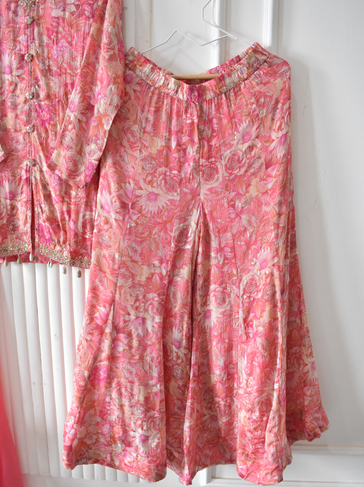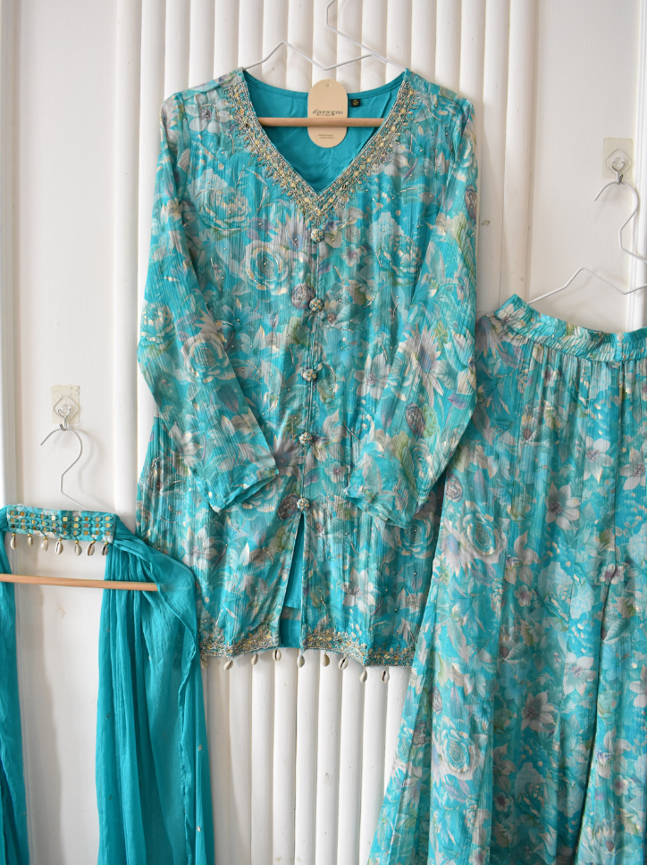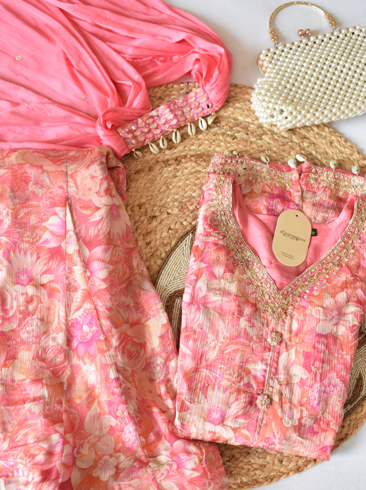 Exude effortless grace with Velina, crafted in luxurious pure chinon fabric. This elegant set features a handworked kurti, flowy divider pants, and a matching dupatta with neckline-style embellishment. Designed for comfort and charm, it’s the perfect pick for weddings, festive...